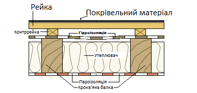 Гідроізоляційна плівка укладається на крокви даху. Кріпити її можна спеціальними скобами, за допомогою степлера – цей спосіб найбільш зручний на практиці. Кріплення посилюється контррейками перерізом 2х5 см. Крім фіксації підпокрівельної плівки контррейки забезпечують гарантований вентиляційний зазор між металочерепицею і гідроізоляцією.